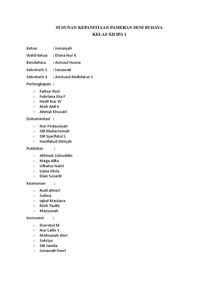 Susunan Panitia Kegiatan Wisata Religi Dan Study Tour from 2.bp.blogspot.com Merujuk pada pengertian di atas, dapat disimpulkan bahwa pameran merupakan media komunikasi antara seniman dan sang apresiator. Struktur kepanitian pameran dan tugasnya,…. Sebutkan susunan panitia dalam kegiatan pameran beserta tugasnya masing masing 1 lihat jawaban adni1 adni1 1) pembimbing: Panitia pameran penyelenggaraan sebuah pameran biasanya dilakukan oleh sebuah panitia. Ketua panitia adalah pimpinan penyelenggaraan pameran yang bertanggungjawab terhadap kelancaran pelaksanaan pameran. Lampiran ini bisa berisi tentang susunan panitia kegiatan, gambar pendukung, serta informasi lainnya untuk melengkapi proposal tersebut. Ketua dalam pelaksanaan tugasnya harus dapat berkomunikasi b ekerja sama dengan baik dan bekerja sama dengan berbagai pihak yang mendukung dan menyukseskan. Penyelenggaraan pameran seni rupa sekolah akan berjalan lancar bila ada pembagian tugas kepanitiaan secara jelas.
